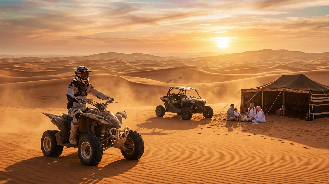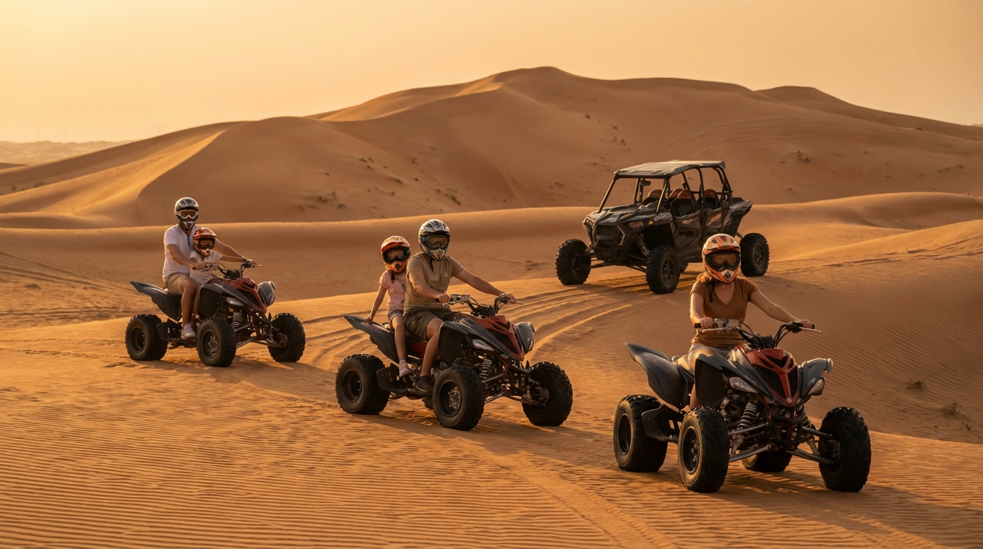 2026 Guide: Quad Biking Tours Dubai prices AED 150-700, ages 5+ (drivers 16+), Al Marmoom, Lahbab, RAK pick-ups. Family safety tips & booking info. Book now